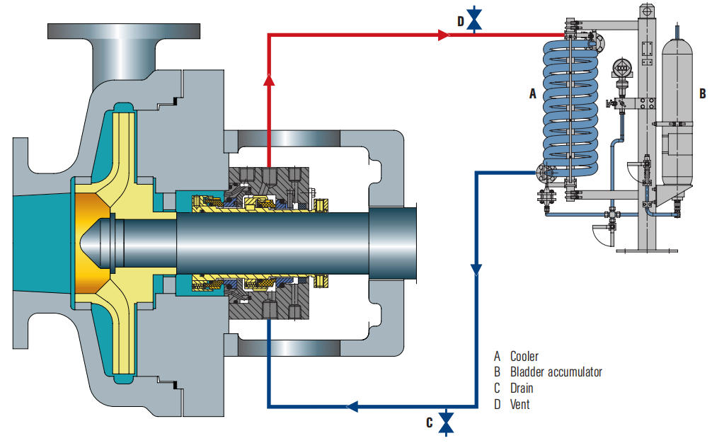 Plan 1 vereist geen externe pijpleidingen. Het dient als interne spoelleiding voor mechanische afdichtingen. In tegenstelling tot Plan 11 wordt de spoelleiding niet blootgesteld aan de atmosfeer, waardoor wordt voorkomen dat vloeistoffen met een hoge viscositeit bij lage temperaturen bevriezen/polymeriseren.